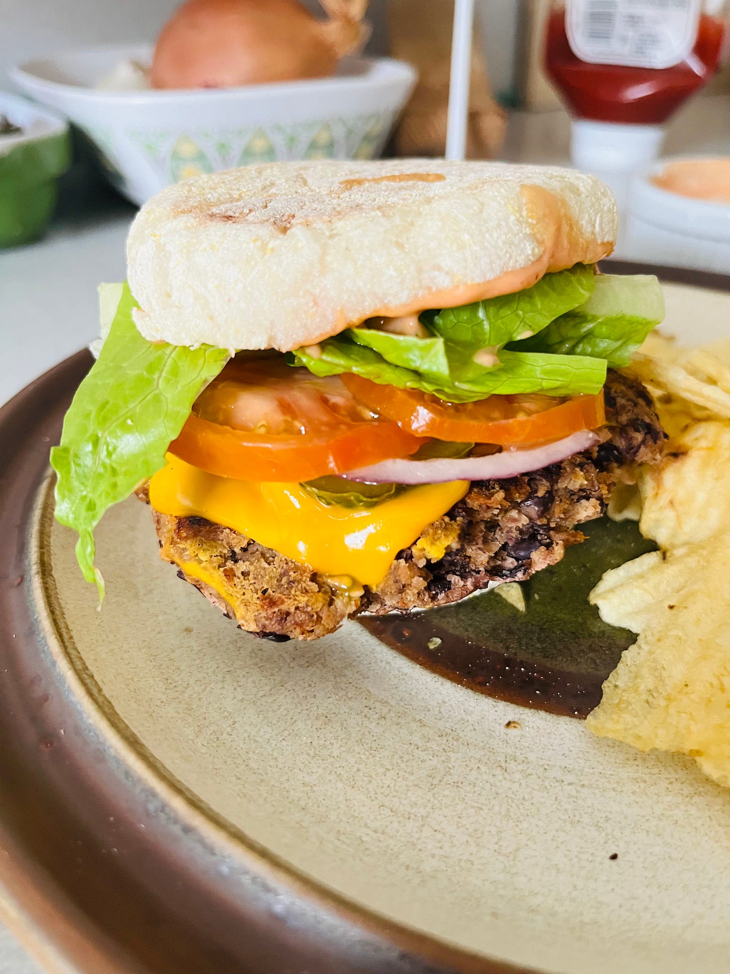 They actually turned out pretty good. A bit mushy, which is to be expected, but the flavor was there. I didn’t feel like running to the store, and we had English muffins on hand, so we used those for the bun. We went for the classic burger vibe and added vegan cheese, homemade fry sauce, yellow mustard, lettuce, tomato, pickle, and red onion. I wanted to make homemade fries, but who has the time for that these days, so we went with potato chips instead.