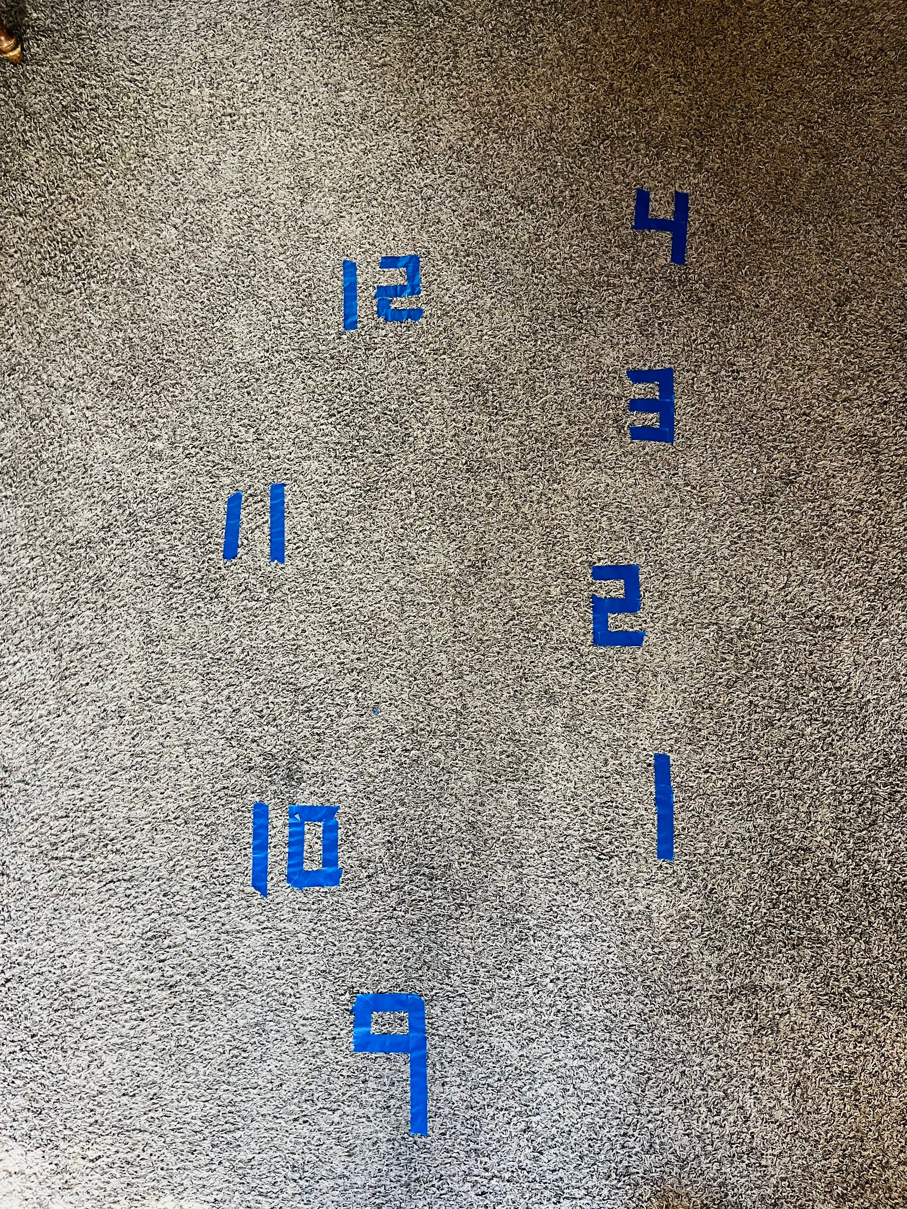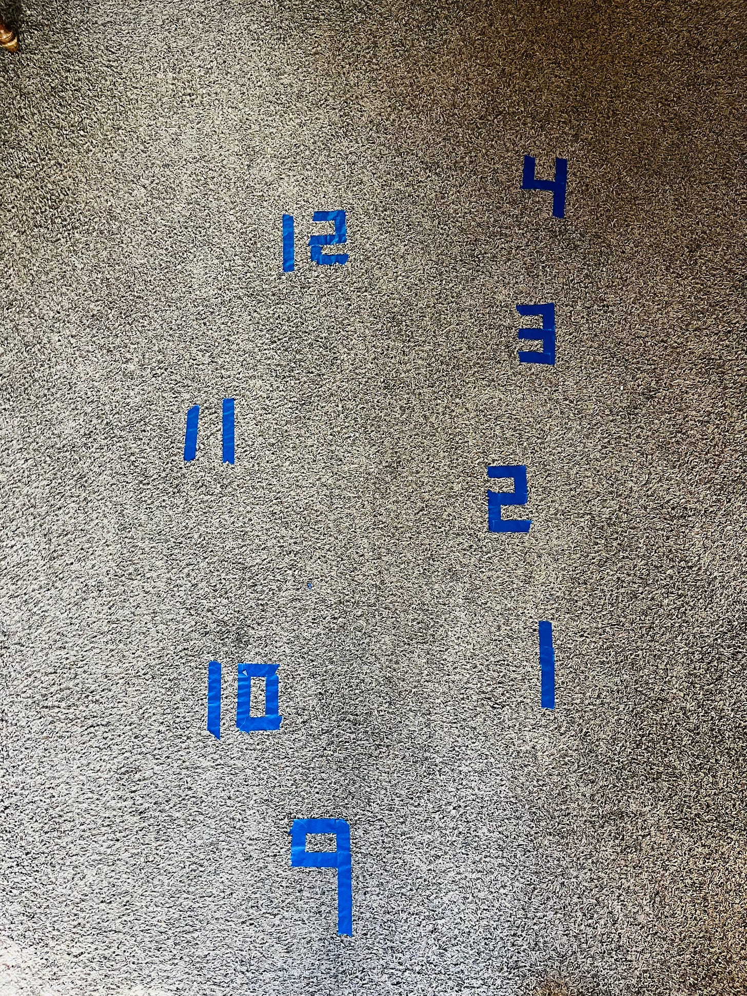 Once the baby was up, I taped down numbers instead of shapes and he hopped from number to number, calling out the numbers. Before this, he was having a little bit of a hard time remembering what came after 11, but after this, he’s hasn’t had trouble once. In fact, I heard him count to 40 today!