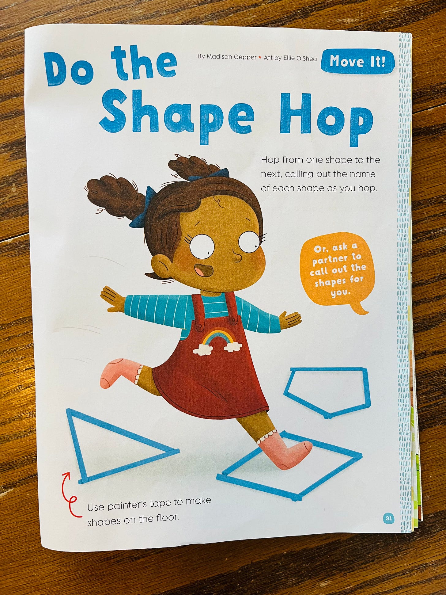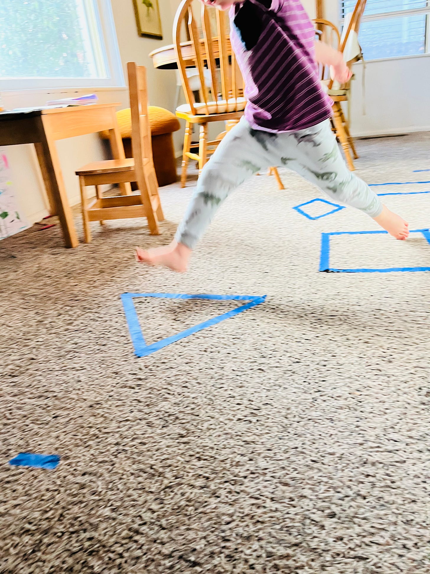 I used painters tape to make different shapes on the floor and he hopped from shape to shape calling out the names of the shape as he landed on each one. He LOVED this and would’ve done it for much longer if I didn’t have to shut it down because the baby was napping and the jumping was too loud (we live in a very old house - it was built in 1905!).